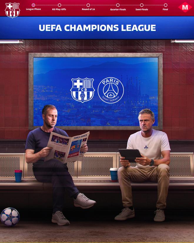 海報中,兩位主帥坐在長椅上,等待著列車的到來。恩里克手中拿著PAD,而弗里克則在一旁看著報紙,報紙上的新聞是2016/17賽季歐冠1/8決賽次回合,巴薩主場6-1逆轉(zhuǎn)巴黎的諾坎普奇跡。有意思的是,當(dāng)時的巴薩主帥恰恰是坐在弗里克旁邊的巴黎現(xiàn)任主帥恩里克。