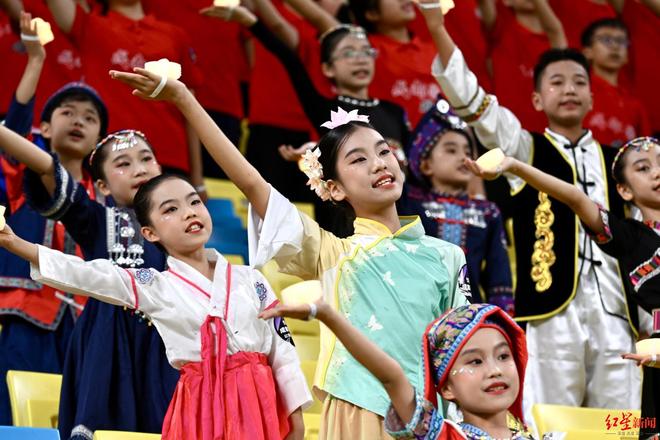 9月30日晚是四川足球、成都足球歷史上的首個亞冠主場比賽,公益看臺上特別展示了中國56個民族的傳統(tǒng)盛裝。600名來自成都中小學的同學們在看臺上莊嚴獻唱《有我》和《愛我中華》,在國慶前夕向祖國致以最深切的愛與祝福。