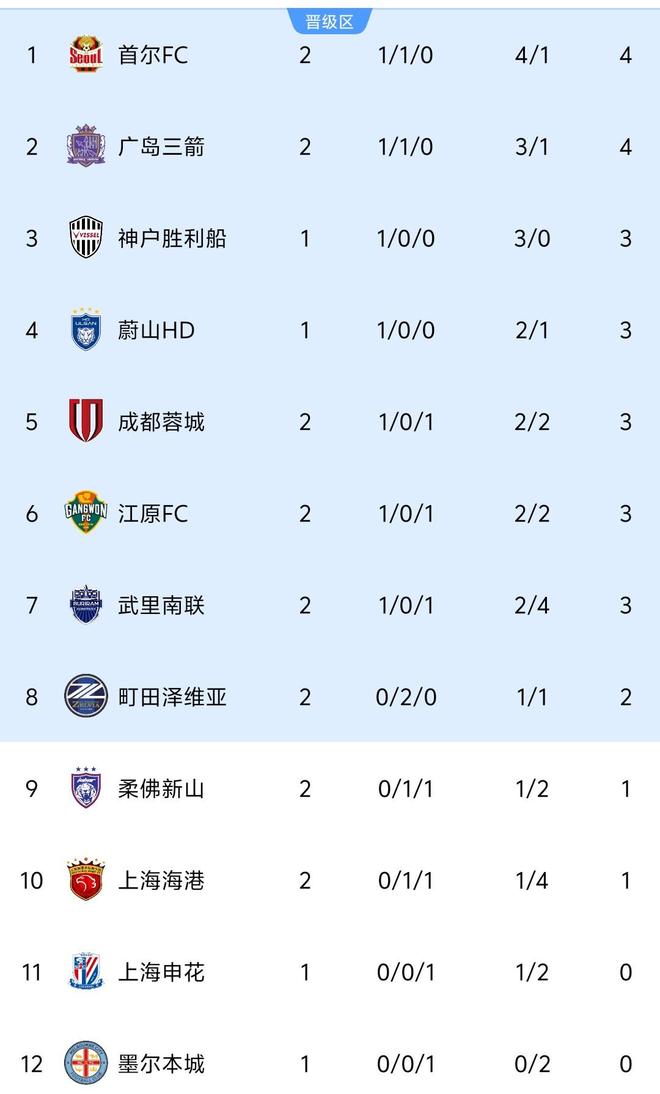 最新積分榜方面,均取得1勝1平的首爾FC和廣島三箭同積4分,首爾FC憑借凈勝球優(yōu)勢(shì)暫時(shí)排在第1,廣島三箭暫居第2。