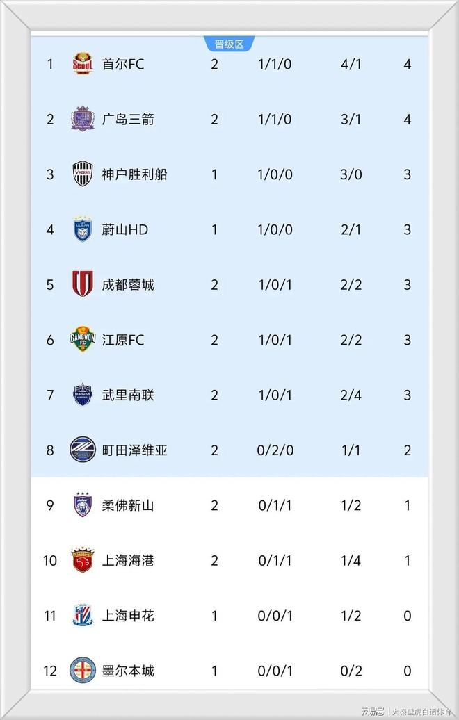 排名榜首的是首爾FC,2戰(zhàn)1勝1負積4分,排名第二的是廣島三箭,同樣積4分;