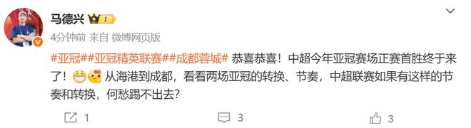 相比于首輪三支球隊全敗的慘狀,本輪截至目前中超球隊取得1勝1平保持不敗。馬德興在社媒上感慨道:“看看兩場亞冠的轉(zhuǎn)換、節(jié)奏,中超聯(lián)賽如果有這樣的節(jié)奏和轉(zhuǎn)換,何愁踢不出去?”